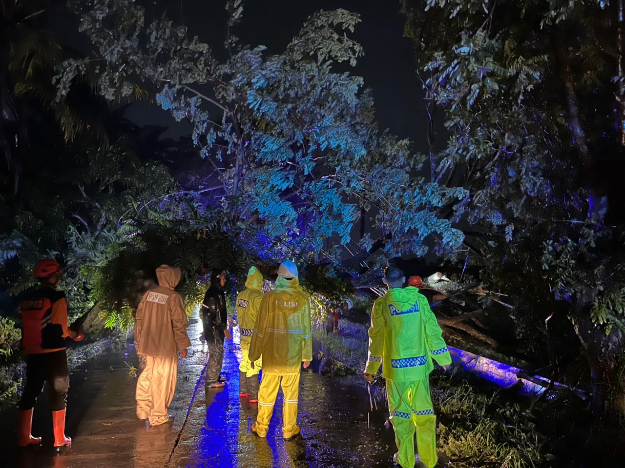 Pantauan di lokasi, tim gabungan yang terdiri dari Polri, TNI, BPBD, PMI, hingga pemerintah desa setempat bahu-mambahu memotong batang pohon menggunakan gergaji mesin agar akses jalan utama tersebut bisa segera dilewati kembali.