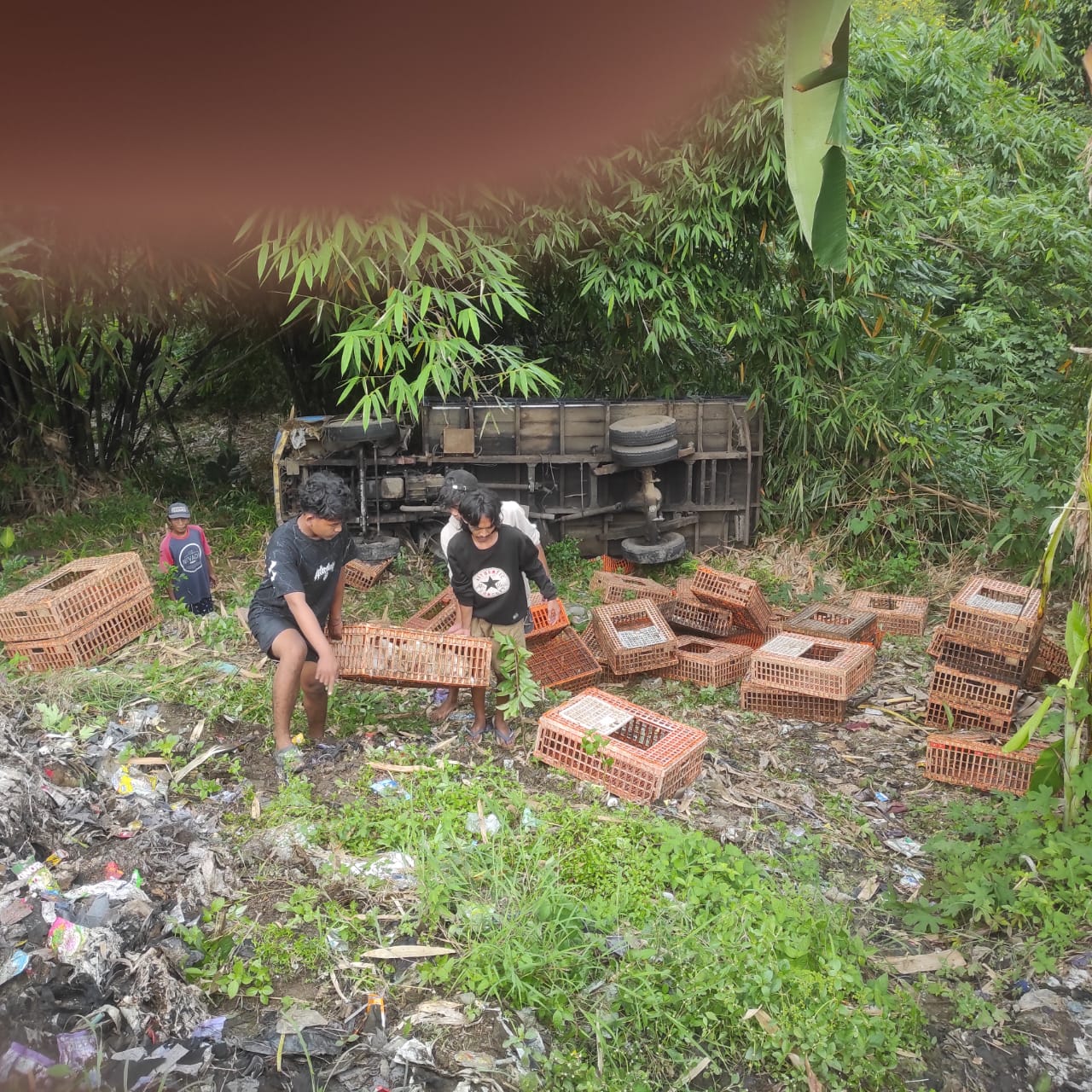 Proses evakuasi kendaraan dan ratusan ekor ayam yang sempat berhamburan telah ditangani oleh petugas bersama warga. (ozy)