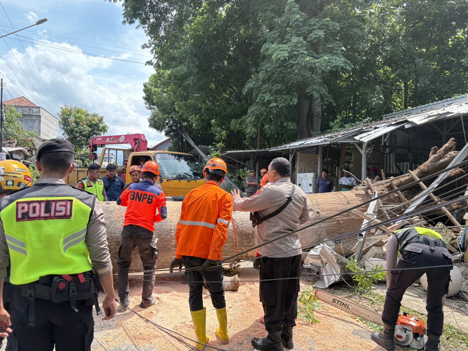 Berdasarkan keterangan saksi di lokasi, sebelum pohon tumbang sempat terdengar suara kayu berderit (“kretek.. kretek..”). Sesaat kemudian, kabel listrik menjuntai dan pohon berukuran besar itu langsung roboh menimpa warung di seberang jalan.