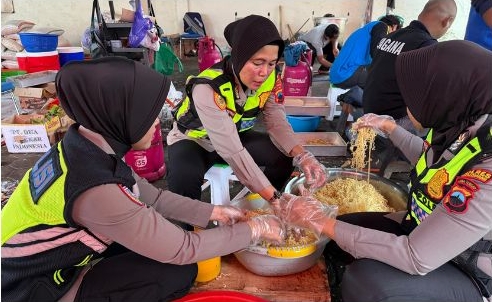 Tak berhenti di situ, personel Polwan juga terlibat aktif dalam proses pengolahan makanan di wajan-wajan raksasa untuk menjamin ketersediaan nasi dan lauk pauk bagi ribuan warga yang rumahnya terendam air.
